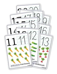 Zestaw zawiera 10 kart w formacie A4(297mm x 210mm), karty są drukowane na grubym papierze 300g, dwustronnie zafoliowane oraz mają zaokrąglone rogi dla komfortu i bezpieczeństwa użytkowania.Zestaw zawiera następujące cyfry: 11, 12, 13, 14, 15, 16, 17, 18, 19, 20.