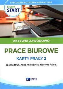Pewny start. Aktywni zawodowo. Prace biurowe. Karty pracy 2 to zestaw kart, które zawierają materiał teoretyczny i praktyczny związany z przygotowaniem ucznia do prac biurowych. Część z nich dotyczy zasad BHP w pracy i podczas korzystania z urządzeń elektrycznych. W publikacji znajdują się zadania matematyczne, zadania związane z samodzielnym czytaniem i pisaniem.