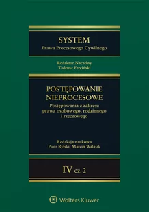 Tom IV Systemu Prawa Procesowego Cywilnego został poświęcony problematyce postępowania nieprocesowego. W 2021 r. ukazała się część 1 tego tomu pod redakcją naukową prof. Tadeusza Erecińskiego oraz prof. Kazimierza Lubińskiego prezentująca zagadnienia ogólne, które odróżniają postępowanie nieprocesowe od procesu. Zagadnienia szczegółowe obejmują postępowania ustanowione dla poszczególnych rodzajów spraw, które są rozpoznawane w trybie nieprocesowym, i zostaną zaprezentowane w kolejnych częściach tomu IV. Poszczególne postępowania nieprocesowe zostały pogrupowane na podstawie kryterium przedmiotu sprawy. W części 2 pod redakcją naukową Piotra Rylskiego i Marcina Walasika przedstawiono postępowania w sprawach z zakresu prawa osobowego, prawa rodzinnego, opiekuńczego i kurateli oraz prawa rzeczowego, przekazane do rozpoznania w postępowaniu nieprocesowym nie tylko na mocy Kodeksu postępowania cywilnego, lecz także innych szczególnych ustaw. Autorzy omówili: - postępowania w sprawach o uznanie za zmarłego i o stwierdzenie zgonu; - postępowanie w sprawach z zakresu ubezwłasnowolnienia; - postępowanie w sprawach z zakresu prawa o aktach stanu cywilnego; - postępowanie w sprawach o zobowiązanie osoby stosującej przemoc w rodzinie do opuszczenia wspólnie zajmowanego mieszkania i jego bezpośredniego otoczenia lub zakazanie zbliżania się do mieszkania i jego bezpośredniego otoczenia, art. 560[2]-560[12] k.p.c.; - postępowania w sprawach małżeńskich; - postępowanie o podział majątku wspólnego małżonków; - postępowanie opiekuńcze; - postępowanie o przysposobienie; - postępowanie z zakresu opieki; - postępowanie w sprawach ze stosunków między rodzicami a dziećmi; - postępowanie w sprawach o odebranie osoby podlegającej władzy rodzicielskiej lub pozostającej pod opieką; - postępowanie w sprawach dotyczących wykonywania kontaktów z dziećmi; - postępowanie z zakresu kurateli; - postępowanie o stwierdzenie zasiedzenia; - postępowanie o stwierdzenie nabycia własności nieruchomości rolnej przez samoistnego posiadacza; - postępowanie w sprawach o przepadek rzeczy; - postępowanie w sprawach zarządu związanego ze współwłasnością i użytkowaniem; - postępowanie o zniesienie współwłasności; - postępowanie o ustanowienie drogi koniecznej i służebności przesyłu; - postępowanie wieczystoksięgowe; - postępowanie o rozgraniczenie nieruchomości. Tom IV część 2 Systemu Prawa Procesowego Cywilnego jest opracowaniem zbiorowym przygotowanym przez autorów reprezentujących różne ośrodki naukowe i instytucje w Polsce. Przejrzysty układ, najwyższy poziom merytoryczny i edytorski dzieła z pewnością sprawią, że publikacja będzie stanowić nieocenioną pomoc przede wszystkim dla prawników praktyków: sędziów, referendarzy sądowych, adwokatów, radców prawnych, notariuszy, kuratorów sądowych.