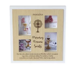 Ramka gigant do zdjęć to wspaniały pomysł, by uwiecznić wspomnienia z Pierwszej Komunii Świętej. Wykonana z solidnej płyty MDF w drewnopodobnej okleinie, wraz z sentencją, posiada 4 miejsca na zdjęcia. Na tylnej ściance ramki są dziurki do zawieszenia na ścianie. Cechy szczególne: typ: ramka do zdjęć do powieszenia lub postawienia, wielkość orientacyjna: