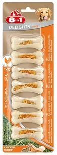 Kości do żucia 8in1 Delights Strong to nowe unikalne połączenie kurczaka i mocno sprasowanej skóry wołowej dla psów, mających dużą skłonność do nadgryzania. Mięso kurczaka zachęca psa do gryzienia, chrupania i obgryzania. Skóra wołowa w 8in1 Delights sprawia, iż czas przyjemności gryzienia znacznie się wydłuża. Twój pies nigdy nie będzie miał dość! 8in1 Delights kości Strong urzekną każdego psa, ponieważ pełne są smacznego mięsa. Wystające kawałki mięsne na powierzchni kości zachęcą psa do wgryzania się, wzmacniając chęć na kolejne mięsne kawałki ukryte w środku.