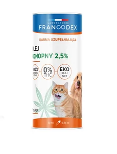 Karma uzupełniająca OLEJ KONOPNY CBD 2,5% Laboratoire Francodex wspomaga utrzymanie dobrego samopoczucia zwierzęcia. CBD wpływa na system endokannabinoidowy, który występuje zarówno u ludzi, jak i zwierząt. Ten system jest zaangażowany w regulację różnych funkcji, takich jak sen, apetyt, ból i reakcje immunologiczne. Badania pokazują spadek odczuwalnych dolegliwości bólowych oraz poprawę ogólnego samopoczucia już po 2 tygodniach stosowania CBD w dawce 2mg/kg dwa razy dziennie*. Stosowanie oleju z CBD polecane jest w przypadku zwierząt, u których występują dolegliwości związane z bólem, alergie i inne choroby przewlekłe oraz związane z zaawansowanym wiekiem, zaburzenia łaknienia, czy stany lękowe różnego pochodzenia.