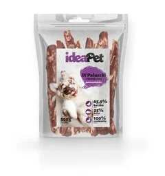 Przysmaki nie powinny przekraczać 10% - 15% dziennej dawki pokarmowej zwierzęcia. Przechowywać szczelnie zamknięte w suchym i chłodnym miejscu. Nie do spożycia przez ludzi. Analiza: Białko surowe - 30,5% Włókno surowe - 1,7% Tłuszcz surowy - 0,5% Popiół surowy - 4% Wilgotność - 20% Skłąd: Mięso z kaczki 65,9%, dorsz 25%, białko sojowe i orzechowe, skrobia kukurydziana, gliceryna