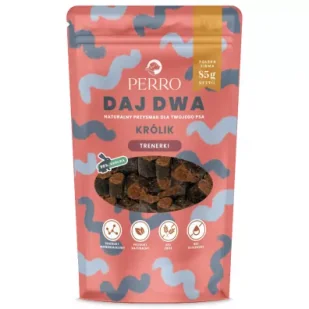 PERRO Daj Dwa to naturalne, suszone przysmaki (bez gliceryny!), które bez wątpienia podkręcą entuzjazm treningowy czworonożnych przyjaciół. Suszone mięso, podzielone na drobne kosteczki to doskonały sposób nagradzania, idealny „wsad” do mat węchowych i zabawek edukacyjnych, a także wartościowe urozmaicenie psiej diety. Bez dodatku cukru.