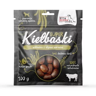 SYTA MICHA Kiełbaski wołowina z algami morskimi 100g Chrupiące przekąski jakich do tej pory nie było, czyli 95% czystego mięsa mięśniowego z wołowiny oraz dodatki superfoods – algi morskie. W składzie nie zawierają gliceryny, konserwantów i innych sztucznych dodatków. Super kiełbaski z wołowiny dla psa to suszone rarytasy w postaci małych kiełbasek o niepowtarzalnym smaku i kuszącym zapachu, których porcjowanie nie sprawia najmniejszych problemów. Delikatny proces suszenia pozwala na zatrzymanie istotnych składników wewnątrz kiełbasek co czyni je wyśmienitym uzupełnieniem codziennej diety w lekkostrawne białko, makro i mikroelementy. Co znajdziemy w składzie? Mięso wołowe - mięso o wysokiej wartości biologicznej będące źródłem witamin, w tym A, E, D i H (biotyna).