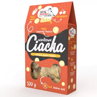 Syta Micha Waniliowe ciacha z dziczyzną, kokosem i morelami 100g ➡️Waniliowe ciacha to ręcznie robione, pieczone ciastka dla psa. Niebywale chrupkie, o przyjemnym waniliowym aromacie przekąski nadziewane mięsem dzika, kokosem i morelami. Do innych składników jakie możemy znaleźć w naszych wypiekach to burak, płatki ziemniaczane czy anyż. ➡️Syta Micha waniliowe ciacha dla psa 100g ➡️Wszystkie dodatki użyte do stworzenia pieczonych waniliowych ciastek są dobrym źródłem witamin z grupy B, witaminy C, A, magnezu, żelaza, potasu, wapnia, kwasów tłuszczowych oraz innych substancji biologicznie czynnych o właściwościach prozdrowotnych. Zalety waniliowych ciastek dla psa od Sytej Michy: