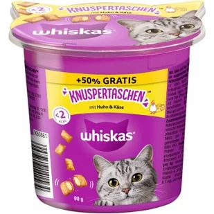 WHISKAS® KNUSPERTASCHEN™ to pyszne przysmaki dla kotów z chrupiącą powłoką i nieodpartym kremowym środkiem. Przysmaki dla kotów z mniej niż 2 kcal na sztukę. Przekąski dla kotów WHISKAS® są wzbogacone witaminami i minerałami, i nie zawierają sztucznych aromatów. Pyszne posiłki i przekąski dla kotów WHISKAS® zawierają wszystko, czego potrzebuje Twój kot. WHISKAS® KNUSPERTASCHEN™ są dostępne w wersji z kurczakiem i serem, łososiem, wołowiną oraz indykiem – koty uwielbiają urozmaicenie.