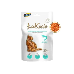 Hilton Liofilizowane przysmaki dla kota z Krylem 30 g – naturalne źródło białka i kwasów Omega-3 Hilton Liofilizowane przysmaki dla kota z Krylem 30 g to wyjątkowy, naturalny smakołyk stworzony z myślą o zdrowiu i potrzebach kotów wszystkich ras. Kryl, pochodzący z czystych wód oceanicznych, jest doskonałym źródłem białka, kwasów Omega-3 i astaksantyny – naturalnego przeciwutleniacza wspierającego układ odpornościowy oraz kondycję skóry i sierści. Proces liofilizacji pozwala zachować pełnię wartości odżywczych i aromat kryla bez potrzeby dodawania konserwantów czy sztucznych polepszaczy. To przysmak o prostym, jednoskładnikowym składzie – idealny dla kotów o wrażliwym układzie pokarmowym. Dlaczego warto wybrać Hilton Liofilizowane przysmaki dla kota z Krylem 30 g? 100% naturalny kryl – bogaty w białko i Omega-3 Bez zbóż, konserwantów i sztucznych dodatków Wspiera zdrową sierść i odporność Delikatny i łatwostrawny – idealny dla kotów z wrażliwym żołądkiem Doskonały jako nagroda lub smaczne uzupełnienie diety Dla kogo Hilton Liofilizowane przysmaki dla kota z Krylem 30 g? Dla kotów wszystkich ras i w każdym wieku Dla kotów z alergiami lub nietolerancjami pokarmowymi Dla kotów potrzebujących wsparcia odporności i zdrowej sierści Dla opiekunów szukających naturalnych, wysokiej jakości przysmaków Główne składniki i ich działanie: