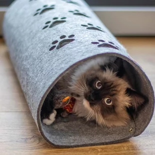 Alpet Legowisko - Tunel dla kota WYMIARY: 58 x 25 cm Filcowe, miękkie legowisko, które może służyć również jako zabawka - tunel dla pupila. Posiada proste zapięcie na napy. Produkt zdobiony jest dziurkami w kształcie łapek, przez które możesz bawić się ze swoim kotkiem. Służą one również jako element przez, który Twój pupil może obserwować otoczenie.