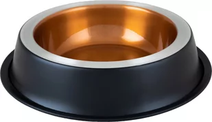 Metalowa miska Delux, 22cm/1. 5l Metalowa miska z błyszczącym środkiem w kolorze miedzi, oraz matowym, czarnym wykończeniu na zewnątrz. Posiada kształt utrudniający przewrócenie się miski oraz antypoślizgową gumową obręcz, która zapobiega przesuwaniu. Nadaje się zarówno do karmy, jak i wody.