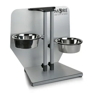 MORE FOR Foodbar Deluxe to system misek, który rośnie razem z pupilem. Dzięki bezstopniowej regulacji wysokości, miski Foodbar można optymalnie dopasować do wielkości psa. W ten sposób jest także chroniony jego kręgosłup. Do zestawu Foodbar należą dwie miski ze stali nierdzewnej, odpowiednie do mycia w zmywarce. Gumowane uchwyty misek zapewniają ciche przyjmowanie posiłków.