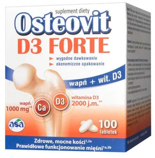 Osteovit D3 Forte zawiera węglan wapnia, który jest źródłem zjonizowanego wapnia (Ca2+). Wapń bierze udział w tworzeniu i mineralizacji kości. Działa wspomagająco w prawidłowym funkcjonowaniu mięśni. Wspomaga prawidłowy proces przewodzenia nerwowego, krzepliwość krwi. Wapń stanowi element równowagi elektrolitycznej organizmu. Wapń przyczynia się do utrzymania prawidłowego metabolizmu energetycznego poprzez wpływ na aktywność wielu enzymów szlaków metabolicznych. Witamina D wspomaga wchłanianie wapnia oraz jego prawidłowy poziom we krwi. Działa wspomagająco dla utrzymania zdrowych kości i prawidłowego funkcjonowania mięśni w naszym organizmie. Zastosowanie: suplementacja diety w składniki zawarte w produkcie. Zalecane spożycie: 2 razy dziennie po 1 tabletce, popijając niewielką ilością płynu. Zaleca się przyjmowanie preparatu w trakcie posiłku ze względu na lepszą przyswajalność substancji czynnych. Składniki: (na 1 tabletkę): węglan wapnia 1475 mg, co odpowiada 500 mg jonów wapnia (Ca2+)(62,5%*); celuloza mikrokrystaliczna, żel celulozowy (substancja dodatkowa, substancja wypełniająca); stearynian magnezu (substancja dodatkowa, substancja przeciwzbrylająca); hydroksypropylometyloceluloza (substancja dodatkowa, substancja wiążąca); alkohol poliwinylowy (PVA) (substancja dodatkowa, substancja wiążąca); sól sodowa karboksymetylocelulozy usieciowana, guma celulozowa usieciowana (substancja dodatkowa, nośnik); witamina D (w postaci witaminy D3 - jako cholekalcyferol) - 25 $324g (1000 j.m.)(500%*). *RWS-Referencyjna Wartość Spożycia. Ważne wskazówki: Nie przekraczać zalecanej porcji do spożycia w ciągu dnia. Suplementy diety nie mogą być stosowane jako substytut (zamiennik) zróżnicowanej diety, ani zdrowego trybu życia. Preparat powinien być przechowywany w sposób niedostępny i niewidoczny dla małych dzieci. Nie zawiera laktozy. Może być stosowany przez chorych na cukrzycę. Preparat bezglutenowy. Producent: ASA Sp. z o.o. ul. Oświęcimska 11 48-100 GŁUBCZYCE.