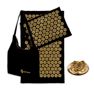 czarny, kolor wypustek: złoty materiały: tkanina zewnętrzna - 70% bawełna, 30% len; wypełnienie maty - 100% włókno kokosowe; wypełnienie poduszki - 100% gryka; wypustki - polipropylen wymiary maty: 68 x 42 x 2 cm (długość x szerokość x grubość) wymiary poduszki: 40 x 30 x 10 cm (długość x szerokość x grubość) wymiary torby: