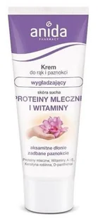 Wygładzający krem do rąk i paznokci proteiny mleczne i witaminy Unikalna formuła kremu zawierająca proteiny mleczne, keratynę roślinną, D-pantenol, witaminy A i E, stanowi idealne rozwiązanie dla wysuszonej i spierzchniętej skóry rąk oraz rozdwajających się i łamliwych paznokci. Krem tworzy na skórze ochronny płaszcz, który spowalnia naturalną ucieczkę wody z naskórka, przez co pomaga utrzymać stabilny poziom nawilżenia skóry. Krem łagodzi podrażnienia, zabezpiecza skórę rąk przed pierzchnięciem i działaniem czynników zewnętrznych. Skutecznie zmiękcza naskórek wokół paznokci, odżywia, chroni i uelastycznia płytkę paznokciową. Regularne stosowanie kremu poprawia kondycję i wygląd paznokci, które przestają się łamać, pękać i rozdwajać.