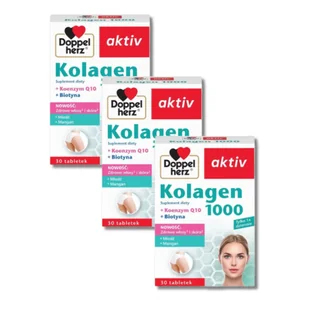 Opis Składniki i zastosowanie Z wiekiem ilość kolagenu zmniejsza się, dlatego warto rozważyć suplementację tego składnika. Suplement diety Doppelherz® aktiv Kolagen 1000 zawiera 1000 mg hydrolizatu kolagenu w połączeniu z biotyną, witaminą C, koenzymem Q10, jak również ze składnikami mineralnymi: miedzią i manganem. Rekomendowany jest dla dorosłych, w celu utrzymania zdrowia włosów1 i skóry 2 . Działanie Kolagen - jest ważnym białkiem strukturalnym skóry.