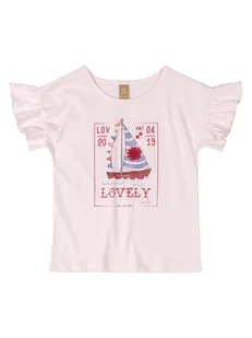 Bluzka z krótkim rękawem dla dziewczynki: kolor: jasnoróżowy nadruk z żaglówką napis "Lovely" rękawy zakończone falbankami Materiał i technologie: 100% bawełna