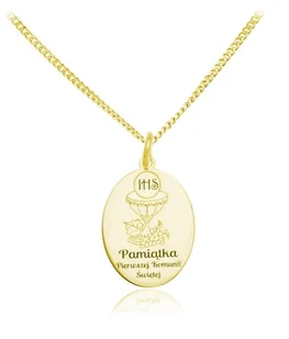 1,6 x 1,2 cm do wyboru kilka długości i splotów łańcuszka galwanicznie pokryty 24k złotem Pudełko i tabliczka Do naszyjnika dołączone są pudełeczko jubilerskie z motywem I Komunii Świętej oraz tabliczka z laminatu grawerskiego z wygrawerowaną treścią. Całość stanowi gotowy, stylowy zestaw na podarunek z okazji I Komunii Świętej. prosimy o wybór szablonu - w gotowych szablonach edycji podlegają tylko i wyłącznie obszary zaznaczone na czerwono. Można także w ogóle zrezygnować z tabliczki, wtedy należy wybrać opcję "bez tabliczki" a w oknie "treść" wpisać "bez treści" i tabliczka nie zostanie wtedy dołączona do zestawu. Medalik na Komunię Świętą Ofiaruj niezwykłą duchową pamiątkę z okazji pierwszej komunii świętej.