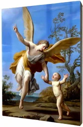 Obraz religijny na desce lipowej, Anioł StróżObraz religijny z postacią Anioła z dzieckiem wykonany na lipowej desce, klejonej. Deska do obrazu została odpowiednio przygotowana, zagruntowana oraz pomalowana emalią satynową dzięki czemu nie straci swoich walorów przez długie lata. Obraz Anioła naniesiony jest dzięki zaawansowanej technice druku bezpośrednio na deskę co gwarantuje wyjątkowo nasycone kolory reprodukcji oraz trwałość co najmniej 100 lat. Obraz na desce dodatkowo został polakierowany na froncie dzięki czemu można go przecierać wilgotną ściereczką. Obraz z tyłu posiada certyfikat naszej firmy wraz z rokiem produkcji oraz zawieszkę typu krokodyl i jest gotowy do zawieszenia.