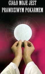Baner na Boże Ciało "Ciało moje jest prawdziwym pokarmem" 75x200 cm Baner religijny przygotowany specjalnie na uroczystość Bożego Ciała. Na środku produktu znajdują się wyciągnięte dłonie udzielające Komunii Świętej. Pierwszej Komunii Świętej. W dolnej części banera widnieją słowa: "Ciało moje jest prawdziwym pokarmem".