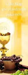 Baner na Boże Ciało "Ciało moje jest. . " 50x130 cm Baner religijny przygotowany specjalnie na uroczystość Bożego Ciała. Na środku produktu znajdują się symbole związane z Sakramentem Eucharystii. W górnej części banera widnieją słowa: "Ciało moje jest prawdziwym pokarmem".