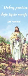 Baner na Boże Ciało "Dobry pasterz daje życie za swoje owce" 75x200 cm Baner religijny przygotowany specjalnie na uroczystość Bożego Ciała. Na środku produktu znajduje się Dobry Pasterz - Jezus Chrystus. W górnej części banera widnieją słowa: " Dobry Pasterz daje życie za swoje owce". Baner religijny w rozmiarze: