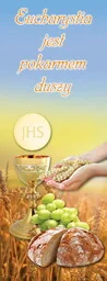 Baner na Boże Ciało "Eucharystia jest pokarmem duszy" 75x200 cm Baner religijny przygotowany specjalnie na uroczystość Bożego Ciała. Na produkcie znajdują się symbole Eucharystii. W górnej części banera religijnego widnieje napis: "Eucharystia jest pokarmem duszy". Baner religijny w rozmiarze: