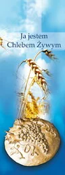 Baner na Boże Ciało "Ja jestem. . " 75x200 cm Baner religijny przygotowany specjalnie na uroczystość Bożego Ciała. Na środku produktu znajdują się symbole związane z Sakramentem Eucharystii. W górnej części banera widnieją słowa: "Ja jestem Chlebem Żywym ".