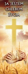 Baner na Boże Ciało "Ja jestem chlebem życia" 75x200 cm Baner religijny przygotowany specjalnie na uroczystość Bożego Ciała. Na produkcie znajdują się wyciągnięte dłonie trzymające chleb. W górnej części banera religijnego widnieje napis: "Ja jestem chlebem życia". Baner religijny w rozmiarze: