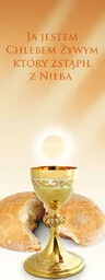 Baner na Boże Ciało "Ja jestem chlebem żywym, który zstąpił z nieba" 75x200 cm Baner religijny przygotowany specjalnie z okazji uroczystości Bożego Ciała. Na środku produktu znajduje się Kielich mszalny z Hostią oraz chleb. W górnej części banera widnieją słowa: "Ja jestem chlebem żywym, który zstąpił z nieba". Baner religijny w rozmiarze:
