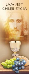 Baner na Boże Ciało "Jam jest . . . " 75x200 cm Baner religijny przygotowany specjalnie na uroczystość Bożego Ciała. Na produkcie znajdują się symbole Eucharystii oraz wizerunek Jezusa Chrystusa. W środku banera religijnego widnieje napis: "Jam jest chleb życia".