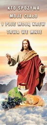 Baner na Boże Ciało "Kto spożywa moje ciało i pije moją krew, trwa we mnie" 75x200 cm Baner religijny przygotowany specjalnie na uroczystość Bożego Ciała. Na produkcie znajduje się wizerunek Jezusa Chrystusa. W górnej części banera religijnego widnieje napis: "Kto spożywa moje ciało i pije moją krew, trwa we mnie". Baner religijny w rozmiarze: