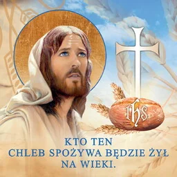 Baner na Boże Ciało "Kto ten chleb spożywa. . " 150x150 cm Baner religijny przygotowany specjalnie na uroczystość Bożego Ciała. Na produkcie znajduje się wizerunek Jezusa Chrystusa. W tle widać krzyż - symbol wielkiej męki i ofiary Jezusa Chrystusa oraz bochenek chleba. W dolnej części banera religijnego widnieje napis: