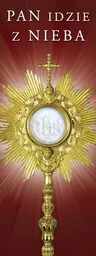 Baner na Boże Ciało "Pan idzie z nieba" 75x200 cm Baner religijny przygotowany specjalnie na uroczystość Bożego Ciała. Na produkcie znajdują się Monstrancja. W górnej części banera religijnego widnieje napis: "Pan idzie z nieba". Baner religijny w rozmiarze: