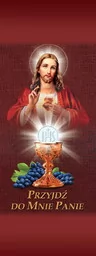 Baner na Boże Ciało "Przyjdź do. . " 75x200 cm Baner religijny przygotowany specjalnie na uroczystość Bożego Ciała. Na środku produktu znajduje się wizerunek Jezusa Chrystusa oraz symbole związane z Sakramentem Eucharystii. W dolnej części banera widnieją słowa: "Przyjdź do mnie Panie".