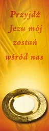 Baner na Boże Ciało "Przyjdź Jezu. . " 75x200 cm Baner religijny przygotowany specjalnie na uroczystość Bożego Ciała. Na środku produktu znajdują się symbole związane z Sakramentem Eucharystii. W górnej części banera widnieją słowa: "Przyjdź Jezu mój zostań wśród nas".