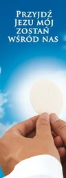 Baner na Boże Ciało "Przyjdź Jezu mój zostań wśród nas" 100x265 cm Baner religijny przygotowany specjalnie na uroczystość Bożego Ciała. W górnej części banera widnieją słowa: "Przyjdź Jezu mój zostań wśród nas". Baner religijny w rozmiarze: 100x265 cm.