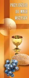 Baner na Boże Ciało "Przyjdźcie do mnie" 75x200 cm Baner religijny przygotowany specjalnie na uroczystość Bożego Ciała. Na środku produktu znajdują się symbole związane z Sakramentem Eucharystii. W górnej części banera widnieją słowa: "Przyjdźcie do mnie wszyscy". Baner religijny w rozmiarze: