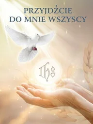 Baner na Boże Ciało "Przyjdźcie do mnie wszyscy" 75x100 cm Baner religijny przygotowany specjalnie na uroczystość Bożego Ciała. Na produkcie znajdują się wyciągnięte dłonie trzymające Hostię. W tle została umieszczona biała gołębica jako symbol obecności i błogosławieństwa Ducha Świętego. W górnej części banera religijnego widnieje napis: "Przyjdźcie do mnie wszyscy".