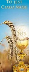 Baner na Boże Ciało "To jest ciało. . " 75x200 cm Baner religijny przygotowany specjalnie na uroczystość Bożego Ciała. Na środku produktu znajdują się symbole związane z Sakramentem Eucharystii. W górnej części banera widnieją słowa: "To jest ciało moje".