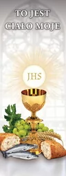 Baner na Boże Ciało "To jest ciało moje" 75x200 cm Baner religijny przygotowany specjalnie na uroczystość Bożego Ciała. Na produkcie znajdują się symbole Eucharystii. W górnej części banera religijnego widnieje napis: "To jest ciało moje". Baner religijny w rozmiarze: