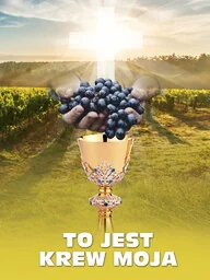 Baner na Boże Ciało "To jest krew moja" 75x100 cm Baner religijny przygotowany specjalnie na uroczystość Bożego Ciała. Na produkcie znajdują się symbole związane z Sakramentem Eucharystii. W dolnej części banera religijnego widnieje napis: "To jest krew moja". Baner religijny w rozmiarze: