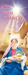 Baner na Boże Narodzenie "Ach, witaj zbawco!" 50x130 cm W centralnej części prezentowanego banera religijnego znajduje się Najświętsza Maryja Panna oraz Dzieciątko Jezus. W górnej części widnieje napis: "Ach, witaj zbawco!". Baner religijny w rozmiarze: 50x130 cm.