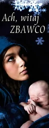 Baner na Boże Narodzenie "Ach, witaj zbawco!" 50x130 cm W centralnej części prezentowanego banera religijnego znajduje się Matka Boża oraz Dzieciątko Jezus. W górnej części widnieje napis: "Ach, witaj zbawco!". Baner religijny w rozmiarze: 50x130 cm.
