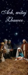 Baner na Boże Narodzenie "Ach, witaj zbawco!" 50x130 cm W centralnej części prezentowanego banera religijnego znajduje się Święta Rodzina oraz Trzej Królowie . W górnej części widnieje napis: "Ach, witaj zbawco!". Baner religijny w rozmiarze: 50x130 cm.