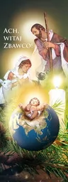 Baner na Boże Narodzenie "Ach, witaj zbawco!" 75x200 cm W centralnej części prezentowanego banera religijnego znajduje się Święta Rodzina. W górnej części widnieje napis: "Ach, witaj zbawco!". Baner religijny w rozmiarze: 75x200 cm.
