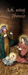 Baner na Boże Narodzenie "Ach, witaj zbawco!" 75x200 cm W centralnej części prezentowanego banera religijnego znajduje się Święta Rodzina. W górnej części widnieje napis: "Ach, witaj zbawco!". Baner religijny w rozmiarze: 75x200 cm.
