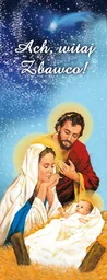 Baner na Boże Narodzenie, "Ach witaj zbawco" 50x130 cm W centralnej części prezentowanego banera religijnego znajduje się Święta Rodzina. W górnej części widnieje Gwiazda Betlejemska oraz napis: "Ach, witaj Zbawco". Baner religijny w rozmiarze: 50x130 cm.