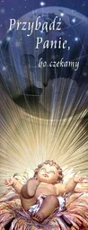 Baner na Boże Narodzenie "Przybądź Panie bo czekamy" 50x130 cm W centralnej części prezentowanego banera religijnego znajduje się Dzieciątko Jezus. W górnej części widnieje napis: "Przybądź Panie bo czekamy". Baner religijny w rozmiarze: 50x130 cm.