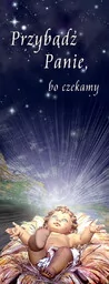 Baner na Boże Narodzenie "Przybądź Panie bo czekamy" 50x130 cm W centralnej części prezentowanego banera religijnego znajduje się Dzieciątko Jezus. W górnej części widnieje napis: "Przybądź Panie bo czekamy". Baner religijny w rozmiarze: 50x130 cm.
