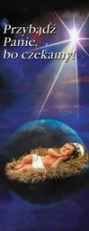 Baner na Boże Narodzenie "Przybądź Panie bo czekamy" 75x200 cm W centralnej części prezentowanego banera religijnego znajduje się Dzieciątko Jezus. W górnej części widnieje napis: "Przybądź Panie bo czekamy". Baner religijny w rozmiarze: 75x200 cm.